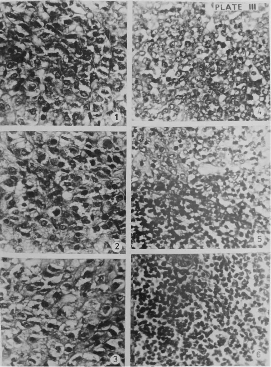 Figure 5. Section of Adrenal gland of Normal Gerbil (1), Control Gerbil (2), Experimental Gerbil after 14 days of BHC + Food treatment (3) & Section of Pancreas of Normal Gerbil (4), Control Gerbil (5), Experimental Gerbil after 14 days of BHC + Food treatment (6). Haematoxylin- Eosin × 400