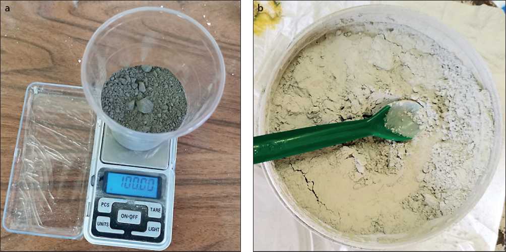 Fig. 4. a) Weighing Portland cement on electronic scales; b) Example of one of the additive components (silicon carbide (SiC) nanopowder)