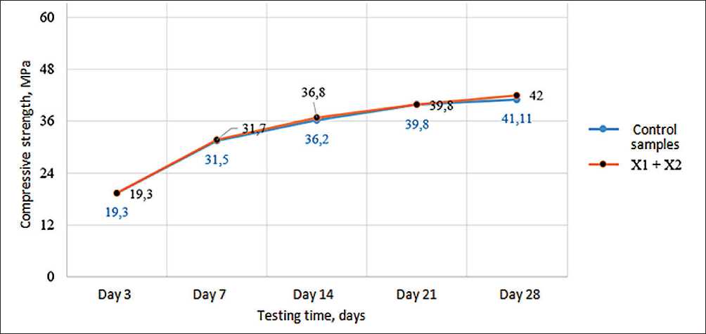 the early stages of hardening (up to 14 days) and at the later stages (up to 28 days). In this regard, samples made with the use of additive combina-tion No. 2 were tested for compressive strength by destructive testing (Fig. 7).