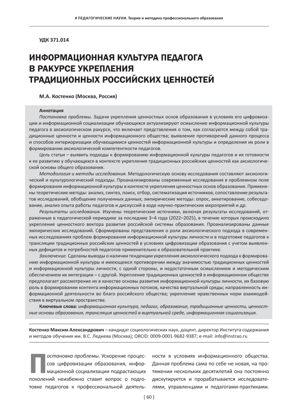 Постановка проблемы. Задачи укрепления ценностных основ образования в условиях его цифровизации и информационной социализации обучающихся актуализируют осмысление информационной культуры педагога в аксиологическом ракурсе, что включает представления о том, как согласуются между собой традиционные ценности и ценности информационного общества; выявление противоречий данного процесса и способов интериоризации обучающимися ценностей информационной культуры и определения их роли в формировании аксиологической компетентности педагогов. Цель статьи – выявить подходы к формированию информационной культуры педагогов и их готовности к ее развитию у обучающихся в контексте укрепления традиционных российских ценностей как аксиологической основы общего образования. Методология и методы исследования. Методологическую основу исследования составляют аксиологический и культурологический подходы. Проанализированы современные исследования в проблемном поле формирования информационной культуры в контексте укрепления ценностных основ образования. Применены теоретические методы: анализ, синтез, поиск, отбор, систематизация источников, сопоставление результатов исследований, обобщение полученных данных; эмпирические методы: опрос, анкетирование, собеседование, анализ опыта работы педагогов и дискуссий в ходе научно-практических мероприятий и др. Результаты исследования. Изучены теоретические источники, включая результаты исследований, отраженные в педагогической периодике за последние 3–4 года (2022–2025), в течение которых происходило укрепление ценностного вектора развития российской системы образования. Проанализированы данные эмпирических исследований. Сформированы представления о роли аксиологического подхода в современных исследованиях проблем формирования информационной культуры личности и в подготовке педагогов к трансляции традиционных российских ценностей в условиях цифровизации образования с учетом выявленных дефицитов и потребностей педагогов применительно к образовательной практике. Заключение. Сделаны выводы о наличии тенденции укрепления аксиологического подхода к формированию информационной культуры и имеющемся противоречии между значимостью традиционных ценностей и информационной культуры личности, с одной стороны, и недостаточным осмыслением и методическим обеспечением их интеграции – с другой. Укрепление традиционных ценностей в информационном обществе предполагает рассмотрение их в качестве основы развития информационной культуры личности, их базовую роль в формировании контента информационных потоков, качества виртуальной среды; направленность информационной деятельности во благо российского общества; укрепление нравственных норм взаимодействия в виртуальном пространстве.