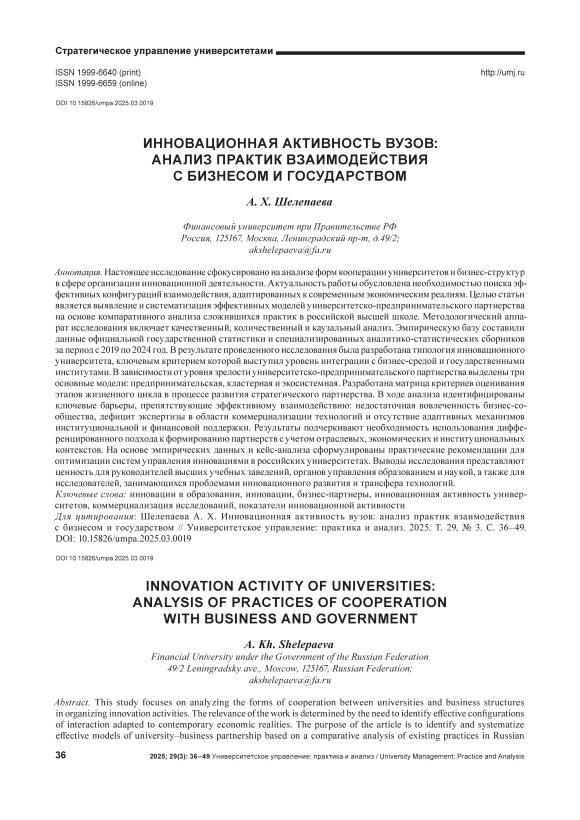 Настоящее исследование сфокусировано на анализе форм кооперации университетов и бизнес-структур в сфере организации инновационной деятельности. Актуальность работы обусловлена необходимостью поиска эффективных конфигураций взаимодействия, адаптированных к современным экономическим реалиям. Целью статьи является выявление и систематизация эффективных моделей университетско-предпринимательского партнерства на основе компаративного анализа сложившихся практик в российской высшей школе. Методологический аппарат исследования включает качественный, количественный и каузальный анализ. Эмпирическую базу составили данные официальной государственной статистики и специализированных аналитико-статистических сборников за период с 2019 по 2024 год. В результате проведенного исследования была разработана типология инновационного университета, ключевым критерием которой выступил уровень интеграции с бизнес-средой и государственными институтами. В зависимости от уровня зрелости университетско-предпринимательского партнерства выделены три основные модели: предпринимательская, кластерная и экосистемная. Разработана матрица критериев оценивания этапов жизненного цикла в процессе развития стратегического партнерства. В ходе анализа идентифицированы ключевые барьеры, препятствующие эффективному взаимодействию: недостаточная вовлеченность бизнес-сообщества, дефицит экспертизы в области коммерциализации технологий и отсутствие адаптивных механизмов институциональной и финансовой поддержки. Результаты подчеркивают необходимость использования дифференцированного подхода к формированию партнерств с учетом отраслевых, экономических и институциональных контекстов. На основе эмпирических данных и кейс-анализа сформулированы практические рекомендации для оптимизации систем управления инновациями в российских университетах. Выводы исследования представляют ценность для руководителей высших учебных заведений, органов управления образованием и наукой, а также для исследователей, занимающихся проблемами инновационного развития и трансфера технологий.