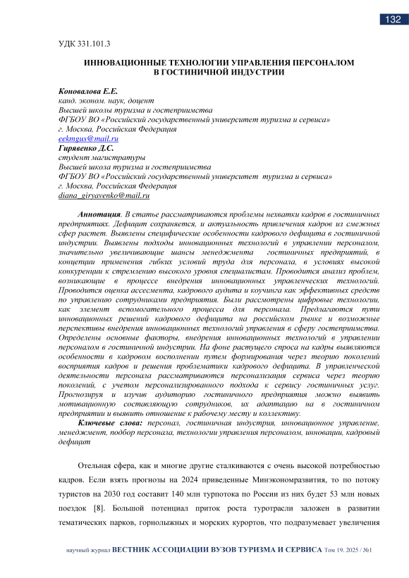 В статье рассматриваются проблемы нехватки кадров в гостиничных предприятиях. Дефицит сохраняется, и актуальность привлечения кадров из смежных сфер растет. Выявлены специфические особенности кадрового дефицита в гостиничной индустрии. Выявлены подходы инновационных технологий в управлении персоналом, значительно увеличивающие шансы менеджмента гостиничных предприятий, в концепции применения гибких условий труда для персонала, в условиях высокой конкуренции к стремлению высокого уровня специалистам. Проводится анализ проблем, возникающие в процессе внедрения инновационных управленческих технологий. Проводится оценка ассесмента, кадрового аудита и коучинга как эффективных средств по управлению сотрудниками предприятия. Были рассмотрены цифровые технологии, как элемент вспомогательного процесса для персонала. Предлагаются пути инновационных решений кадрового дефицита на российском рынке и возможные перспективы внедрения инновационных технологий управления в сферу гостеприимства. Определены основные факторы, внедрения инновационных технологий в управлении персоналом в гостиничной индустрии. На фоне растущего спроса на кадры выявляются особенности в кадровом восполнении путем формирования через теорию поколений восприятия кадров и решения проблематики кадрового дефицита. В управленческой деятельности персонала рассматриваются персонализация сервиса через теорию поколений, с учетом персонализированного подхода к сервису гостиничных услуг. Прогнозируя и изучив аудиторию гостиничного предприятия можно выявить мотивационную составляющую сотрудников, их адаптацию на в гостиничном предприятии и выявить отношение к рабочему месту и коллективу.