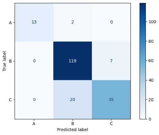 Этап 3. Матрица ошибок, представленная на рисунке 1, показывает, что модель, обученная для интегрального показателя I-score, на тесте неправильно определила лишь 13,3 % регионов класса ‘A’ (2 : (13 + 2) 100 %), 5,6 % – класса ‘B’ (7 : (119 + 7) 100 %) и 26,7 % регионов класса ‘C’ (20 : (55 + 20) 100 %). При этом F1-score (мера производительности модели, которая объединяет точность и полноту в единую метрику в диапазоне от 0 до 1, т. е. служит гармоническим средним точности и полноты) равен 0,83. Это достаточно качественный результат.