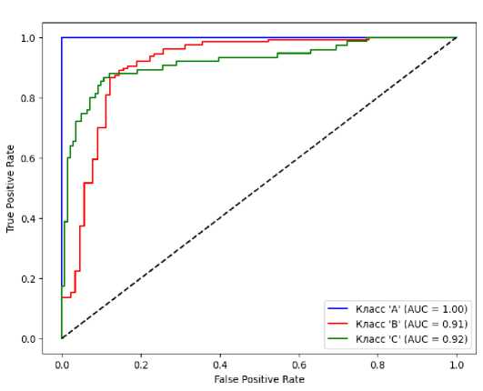 Графики ROC/AUC продемонстрировали достаточно качественные результаты на тесте для всех трех рейтингов (рис. 2). Средний ROC/AUC составил 0,94.