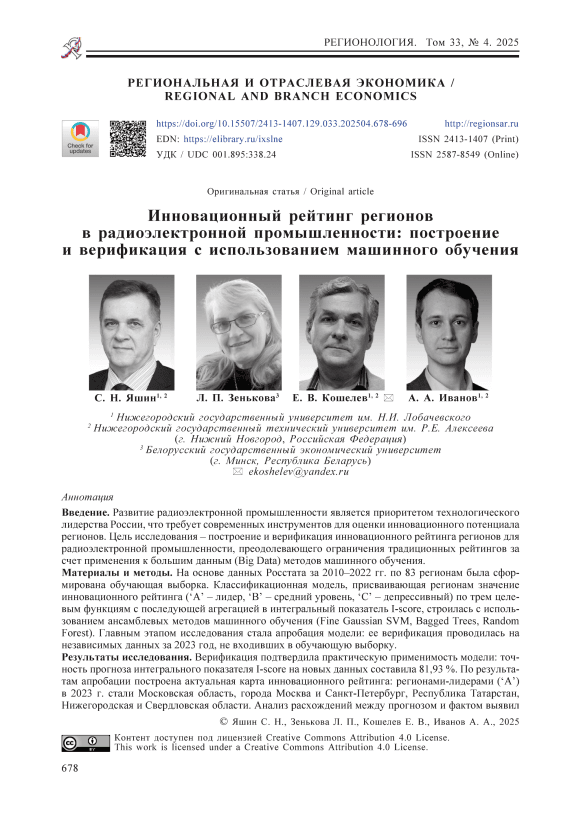 Введение. Развитие радиоэлектронной промышленности является приоритетом технологического лидерства России, что требует современных инструментов для оценки инновационного потенциала регионов. Цель исследования – построение и верификация инновационного рейтинга регионов для радиоэлектронной промышленности, преодолевающего ограничения традиционных рейтингов за счет применения к большим данным (Big Data) методов машинного обучения. Материалы и методы. На основе данных Росстата за 2010–2022 гг. по 83 регионам была сформирована обучающая выборка. Классификационная модель, присваивающая регионам значение инновационного рейтинга (‘A’ – лидер, ‘B’ – средний уровень, ‘C’ – депрессивный) по трем целевым функциям с последующей агрегацией в интегральный показатель I-score, строилась с использованием ансамблевых методов машинного обучения (Fine Gaussian SVM, Bagged Trees, Random Forest). Главным этапом исследования стала апробация модели: ее верификация проводилась на независимых данных за 2023 год, не входивших в обучающую выборку. Результаты исследования. Верификация подтвердила практическую применимость модели: точность прогноза интегрального показателя I-score на новых данных составила 81,93 %. По результатам апробации построена актуальная карта инновационного рейтинга: регионами-лидерами (‘A’) в 2023 г. стали Московская область, города Москва и Санкт-Петербург, Республика Татарстан, Нижегородская и Свердловская области. Анализ расхождений между прогнозом и фактом выявил потенциал роста Новосибирской области и возможные риски для лидерских позиций Республики Башкортостан, Пермского края и Челябинской области. Обсуждение и заключение. Апробированная методика позволяет строить точные и устойчивые оценки инновационного развития регионов в отрасли радиоэлектронной промышленности. Результаты верификации демонстрируют не только прогнозную силу модели, но и ее ценность для выявления латентных тенденций. Полученные выводы имеют практическую значимость для органов государственной власти и крупных компаний при планировании региональной и отраслевой политики.