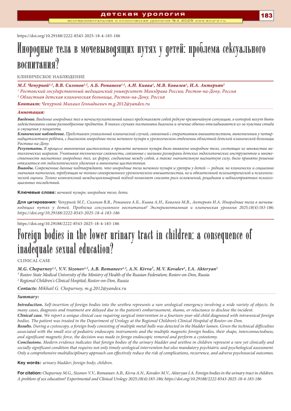 Введение. Введение инородных тел в мочеиспускательный канал представляет собой редкую чрезвычайную ситуацию, в которой могут быть задействованы самые разнообразные предметы. В таких случаях постановка диагноза и лечение обычно откладываются из-за чувства стыда и смущения у пациента. Клиническое наблюдение. Представлен уникальный клинический случай, связанный с оперативным вмешательством, выполненным у четырнадцатилетнего ребёнка, с диагнозом инородные тела мочевого пузыря в урологическом отделении областной детской клинической больницы Ростова-на-Дону. Результаты. В процессе выполнения цистоскопии в просвете мочевого пузыря было выявлено инородное тело, состоящее из множества металлических шариков. Учитывая технические сложности, связанные с малыми размерами детских эндоскопических инструментов и множественность магнитных инородных тел, их форму, соединение между собой, а также значительную магнитную силу, было принято решение отказаться от эндоскопического удаления и выполнена цистостомия. Выводы. Современные данные подтверждают, что инородные тела мочевого пузыря и уретры у детей — редкая, но клинически и социально значимая патология, требующая не только своевременного урологического вмешательства, но и обязательной психиатрической и психологической оценки. Только комплексный междисциплинарный подход позволяет снизить риск осложнений, рецидивов и неблагоприятных психосоциальных последствий.
