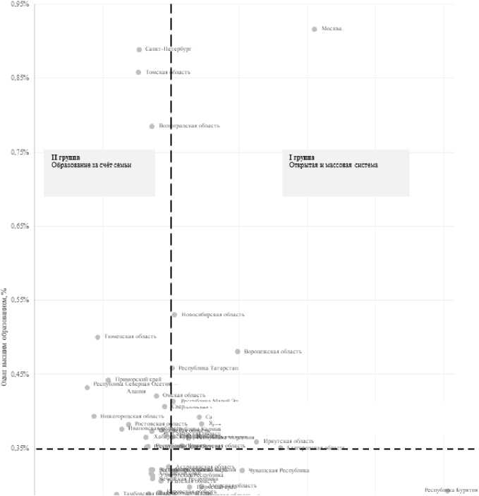 Предложенный ниже подход позволяет выделить группы регионов с разными профилями доступа к высшему образованию, его массовости и качества, а также выявить территории, в которых траектория образования превращается в институциональную ловушку.