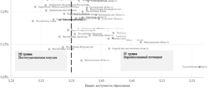 (например, СПО) или ранний выход на рынок труда. Доступность здесь не трансформируется в охват — возможно, из-за отсутствия образовательных мотиваций или слабой региональной экономики, не требующей высокой квалификации. Эти регионы требуют политики стимулов, направленных на формирование устойчивого спроса на ВО и укрепление институционального предложения.