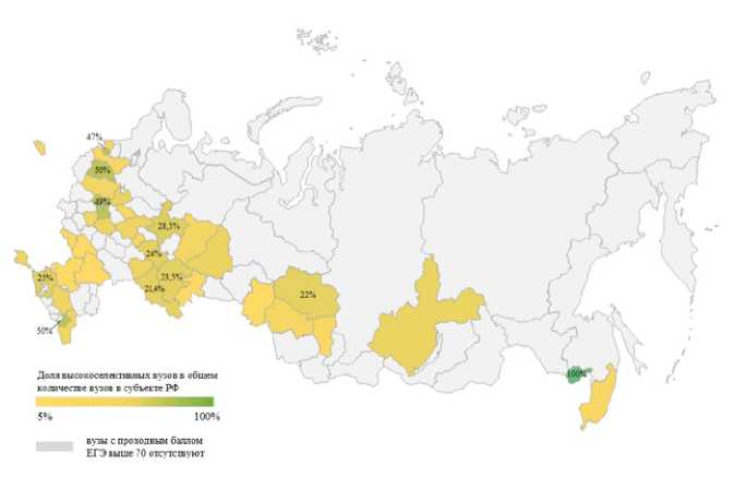 Для оценки доступа к высокоселективным вузам было проведено сопоставление общего количества высших учебных заведений в субъекте РФ с числом вузов, в которых средний балл ЕГЭ зачисленных студентов превышает 70 баллов (бюджетные и платные места, 2023 год). Такой порог используется в ряде исследований как критерий академической селективности, указывающим на наличие конкурсного отбора, ориентированного на абитуриентов с высокой академической успеваемостью. Полученная метрика — доля высокоселективных вузов от общего числа вузов в регионе — демонстрирует степень концентрации образовательного капитала и возможностей для абитуриентов, ориентированных на программы высокого уровня. Результаты были визуализированы в виде картографической диаграммы ( Рисунок 2 ). Особо примечательны регионы, где такие вузы отсутствуют вовсе — они закрашены серым цветом.