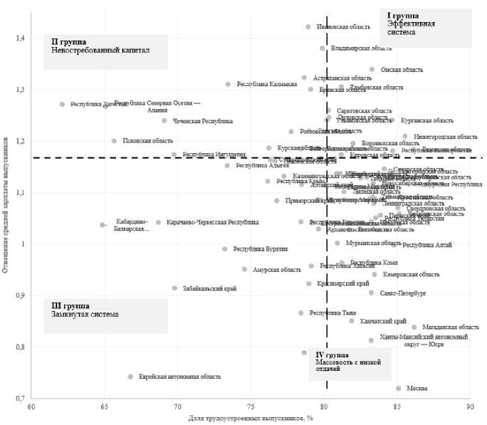 IV группа («Массовость с низкой отдачей») – системы, в которых выпускники трудоустраиваются, но получают заработную плату ниже средней по региону. При этом в отдельных случаях, таких как Москва, наблюдаемая низкая относительная зарплата выпускников может объясняться статистическим искажением средней заработной платы по субъекту: наличие в столице высокооплачиваемых профессиональных групп в сферах IT, финансов, корпоративного управления значительно завышает общее среднее значение, по отношению к которому рассчитывается показатель. В других субъектах, например, Республика Саха (Якутия), Камчатский край и Ханты-Мансийский автономный округ, высокий уровень трудоустройства может быть обеспечен за счёт бюджетного или квазигосударственного секторов, где сохраняется стабильный, но относительно невысокий уровень оплаты труда. Также возможно, что молодые специалисты занимают позиции, не требующие высшего образования, что свидетельствует о слабой связи между уровнем подготовки и потребностями локального рынка труда. Это указывает на риски неэффективной реализации человеческого капитала, когда расширение охвата высшим образованием не сопровождается созданием соответствующих экономических возможностей.