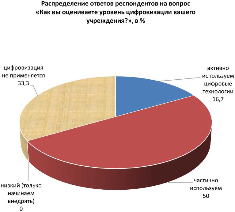 Примерами успешной адаптации учреждений культуры в Республике Бурятия к новым реалиям могут быть VR технологии в музеях города, онлайн-трансляции мероприятий в театрах, услуги электронной книговыдачи в библиотеках, что позволяет читателям пользоваться ее ресурсами дистанционно. Эти инициативы показывают, что современные технологии становятся нашей повседневностью, делают услуги и продукты учреждений культуры еще более востребованными и привлекательными. Однако цифровой мир воцарился далеко не во всех учреждениях культуры г. Улан-Удэ (диаграмма 1), а потому разработка и внедрение многих креативных идей пока идут достаточно медленными темпами. При этом надо отметить, что и в других регионах страны, и в разных сферах жизнедеятельности общества данный процесс развивается крайне неравномерно [4, с. 91–103; 6, с. 9–10].