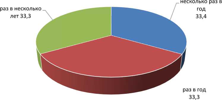 Обучение и повышение квалификации позволяет сотрудникам лучше разбираться в происходящих изменениях, улавливать современные тенденции, находить решение возникающих проблем посредством создания и реализации значимых культурных проектов. Кроме того, обучение способствует обновлению теоретических знаний, освоению актуальных методик и навыков по работе с новыми инструментами (цифровые технологии, мультимедийные системы и др.), повышению квалификации. Больше половины опрошенных респондентов заявляет о регулярном посещении мероприятий, направленных на совершенствование про- фессионального мастерства: 33,4% делают это несколько раз в год, 33,3% — не менее одного раз в год (диаграмма 4).