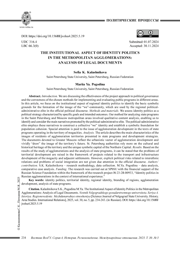 Цитирование. Калашникова С. К., Погодина М. Я. Институциональный аспект политики идентичности в столичных агломерациях: анализ нормативных правовых актов // Вестник Волгоградского государственного университета. Серия 4, История. Регионоведение. Международные отношения. – 2025. – Т. 30, № 5. – С. 234–243. – DOI: