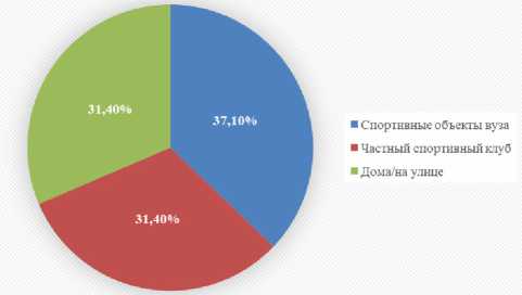 (45 %) и йога/пилатес (30 %). Причем исследование показало, что нет явной привязанности студентов к спортивным объектам и это может быть как вуз, так и прочие варианты, данный аспект связан еще и с развитыми внеучебными связями РНИМУ, так для студентов предоставляются скидки в частных спортивных клубах, что исходя из опроса положительно влияет на занятие спортом (рис. 1).