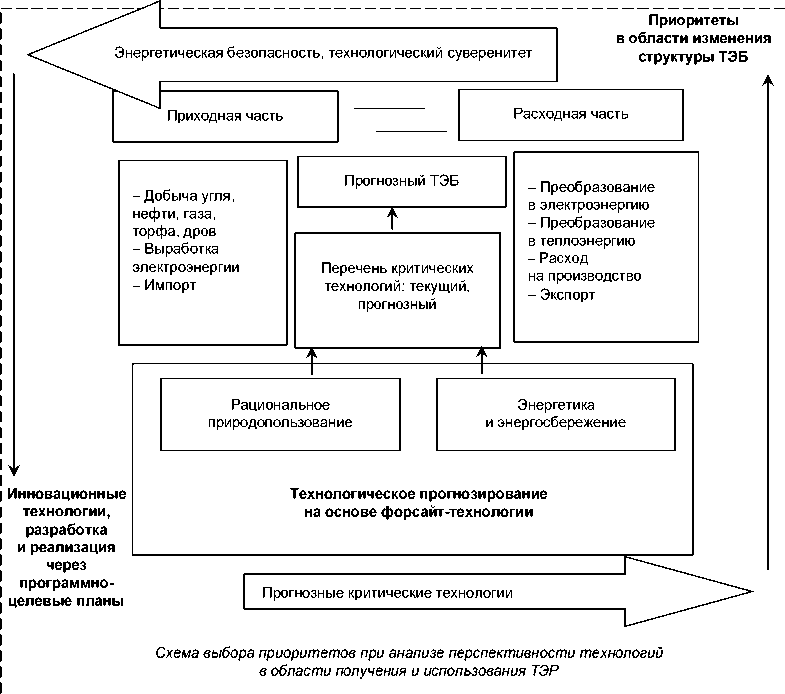 На рисунке 1 в формализованном виде представлена взаимосвязь прогнозного ТЭБ и технологического прогнозирования, встроенных в цикл выбора приоритетов при анализе перспективности технико-технологических решений в области получения и использования ТЭР. С целью получения обоснованных приоритетных направлений для поиска технологических решений в долгосрочном периоде (не менее 25‒30 лет) целесообразно использовать технологический форсайт, а на этапе разработки программно-целевых планов на среднесрочную перспективу возможно придерживаться этапов, отраженных в утвержденных Правилах формирования, корректировки и реализации приоритетных направлений развития науки, технологий и техники в РФ и перечня критических технологий РФ1 в пункте 4 «Формирование и корректировка приоритетных направлений и перечня критических технологий осуществляются в следующие 2 этапа»: