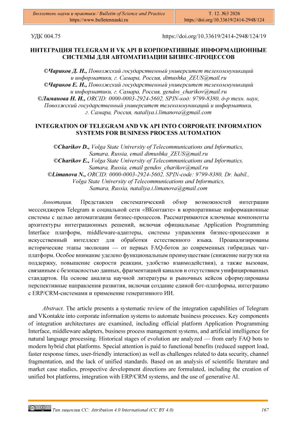 The article presents a systematic review of the integration capabilities of Telegram and VKontakte into corporate information systems to automate business processes. Key components of integration architectures are examined, including official platform Application Programming Interface, middleware adapters, business process management systems, and artificial intelligence for natural language processing. Historical stages of evolution are analyzed — from early FAQ bots to modern hybrid chat platforms. Special attention is paid to functional benefits (reduced support load, faster response times, user-friendly interaction) as well as challenges related to data security, channel fragmentation, and the lack of unified standards. Based on an analysis of scientific literature and market case studies, prospective development directions are formulated, including the creation of unified bot platforms, integration with ERP/CRM systems, and the use of generative AI.