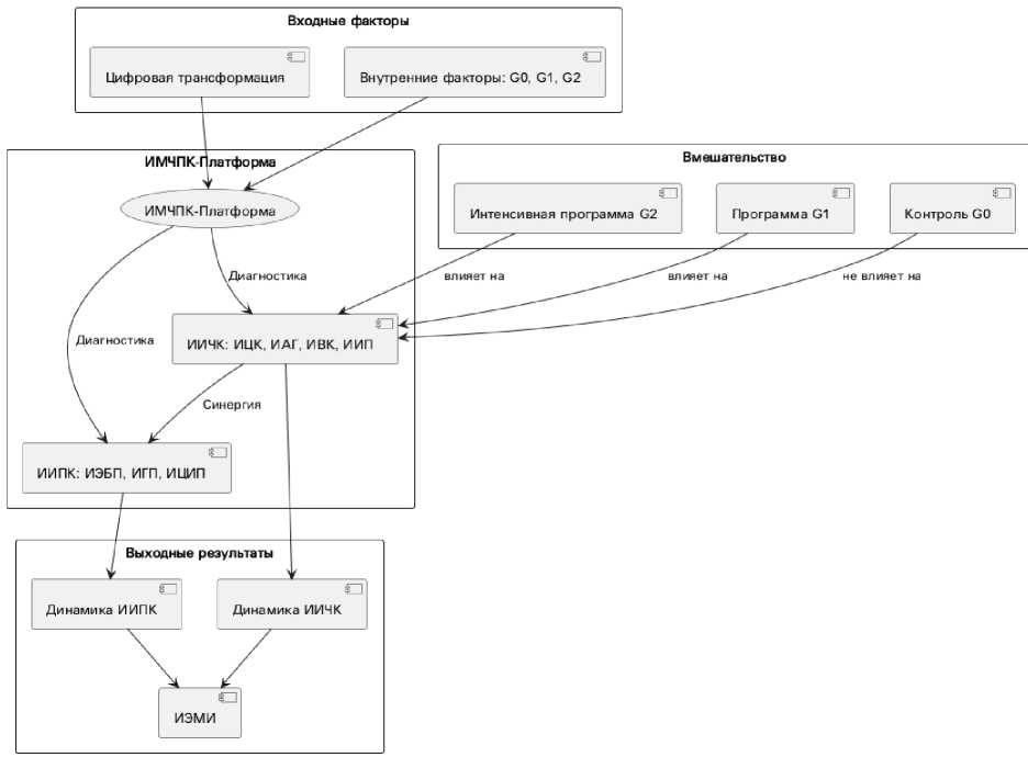ИЭМИ ИИЧК ИИПК (5) где параметры 0,6 и 0,4 интерпретируются как эластичности, отражающие относительный вклад человеческого и процессного капитала соответственно (при условии + = 1). Такое соотношение соответствует логике модели, согласно которой человеческий капитал выступает первичным драйвером изменений, а процессный капитал – механизмом их реализации.