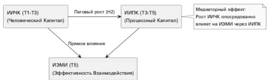 Влияние интегрального индекса человеческого капитала (ИИЧК) на процессный капитал (ИИПК) и синергетический эффект (ИЭМИ): для проверки гипотезы о лаговом росте ИИПК и максимизации ИЭМИ был проведен анализ влияния роста ИИЧК на ключевые метрики процессного капитала, агрегированные в ИИПК (формула (4)). Данные были получены из системных выгрузок и экспертных оценок процессов, связанных с продуктами, разрабатываемыми каждой группой. Сравнение продуктовых метрик и процессов по группам на момент завершения исследования
