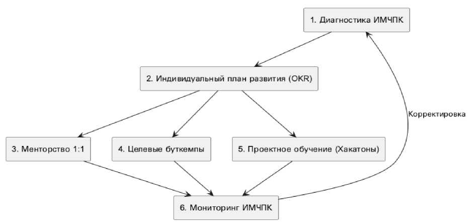 G1 (Программная группа), получившая доступ к ИМЧПК-платформе, e-learning (4–6 ч/мес.) и ежемесячный разбор кейсов; и G2 (Интенсивная программа), для которой была реализована интенсивная программа развития, включающая буткемпы (12–16 ч/мес.), менторство 1:1, OKR по компетенциям и активное участие в пилотных проектах и хакатонах.