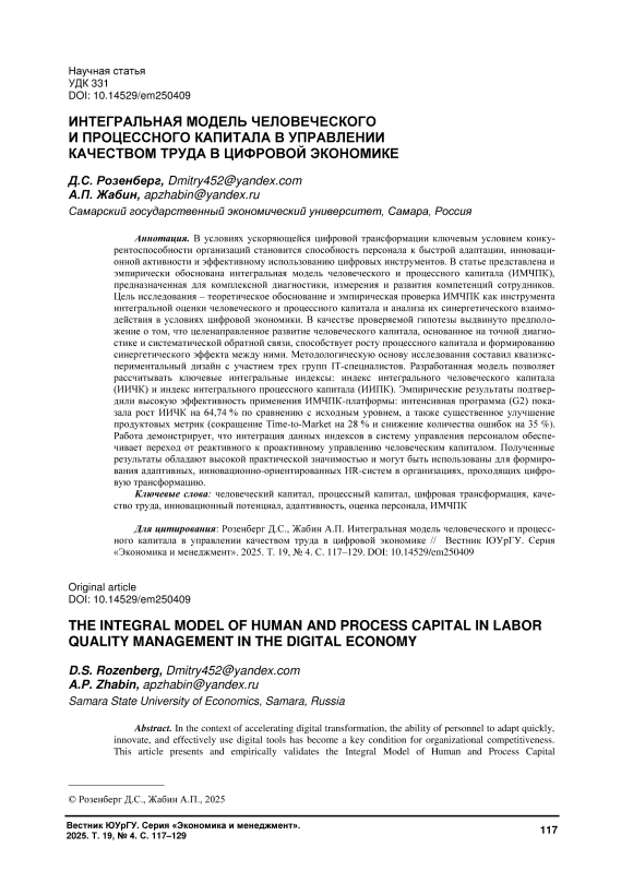 В условиях ускоряющейся цифровой трансформации ключевым условием конкурентоспособности организаций становится способность персонала к быстрой адаптации, инновационной активности и эффективному использованию цифровых инструментов. В статье представлена и эмпирически обоснована интегральная модель человеческого и процессного капитала (ИМЧПК), предназначенная для комплексной диагностики, измерения и развития компетенций сотрудников. Цель исследования – теоретическое обоснование и эмпирическая проверка ИМЧПК как инструмента интегральной оценки человеческого и процессного капитала и анализа их синергетического взаимодействия в условиях цифровой экономики. В качестве проверяемой гипотезы выдвинуто предположение о том, что целенаправленное развитие человеческого капитала, основанное на точной диагностике и систематической обратной связи, способствует росту процессного капитала и формированию синергетического эффекта между ними. Методологическую основу исследования составил квазиэкспериментальный дизайн с участием трех групп IT-специалистов. Разработанная модель позволяет рассчитывать ключевые интегральные индексы: индекс интегрального человеческого капитала (ИИЧК) и индекс интегрального процессного капитала (ИИПК). Эмпирические результаты подтвердили высокую эффективность применения ИМЧПК-платформы: интенсивная программа (G2) показала рост ИИЧК на 64,74 % по сравнению с исходным уровнем, а также существенное улучшение продуктовых метрик (сокращение Time-to-Market на 28 % и снижение количества ошибок на 35 %). Работа демонстрирует, что интеграция данных индексов в систему управления персоналом обеспечивает переход от реактивного к проактивному управлению человеческим капиталом. Полученные результаты обладают высокой практической значимостью и могут быть использованы для формирования адаптивных, инновационно-ориентированных HR-систем в организациях, проходящих цифровую трансформацию.