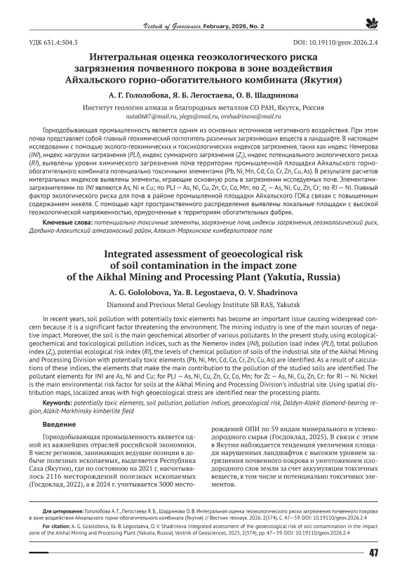 Горнодобывающая промышленность является одним из основных источников негативного воздействия. При этом почва представляет собой главный геохимический поглотитель различных загрязняющих веществ в ландшафте. В настоящем исследовании с помощью эколого-геохимических и токсикологических индексов загрязнения, таких как индекс Немерова (INI), индекс нагрузки загрязнения (PLI), индекс суммарного загрязнения (Zc), индекс потенциального экологического риска (RI), выявлены уровни химического загрязнения почв территории промышленной площадки Айхальского горно-обогатительного комбината потенциально токсичными элементами (Pb, Ni, Mn, Cd, Co, Cr, Zn, Cu, As). В результате расчетов интегральных индексов выявлены элементы, играющие основную роль в загрязнении исследуемых почв. Элементами-загрязнителями по INI являются As, Ni и Cu; по PLI — As, Ni, Cu, Zn, Cr, Co, Mn; по Zc — As, Ni, Cu, Zn, Cr; по RI — Ni. Главный фактор экологического риска для почв в районе промышленной площадки Айхальского ГОКа связан с повышенным содержанием никеля. С помощью карт пространственного распределения выявлены локальные площадки с высокой геоэкологической напряженностью, приуроченные к территориям обогатительных фабрик.