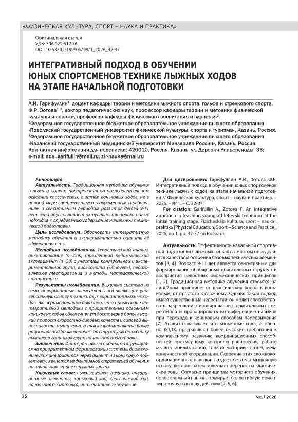 ИНТЕГРАТИВНЫЙ ПОДХОД В ОБУЧЕНИИ ЮНЫХ СПОРТСМЕНОВ ТЕХНИКЕ ЛЫЖНЫХ ХОДОВ НА ЭТАПЕ НАЧАЛЬНОЙ ПОДГОТОВКИ