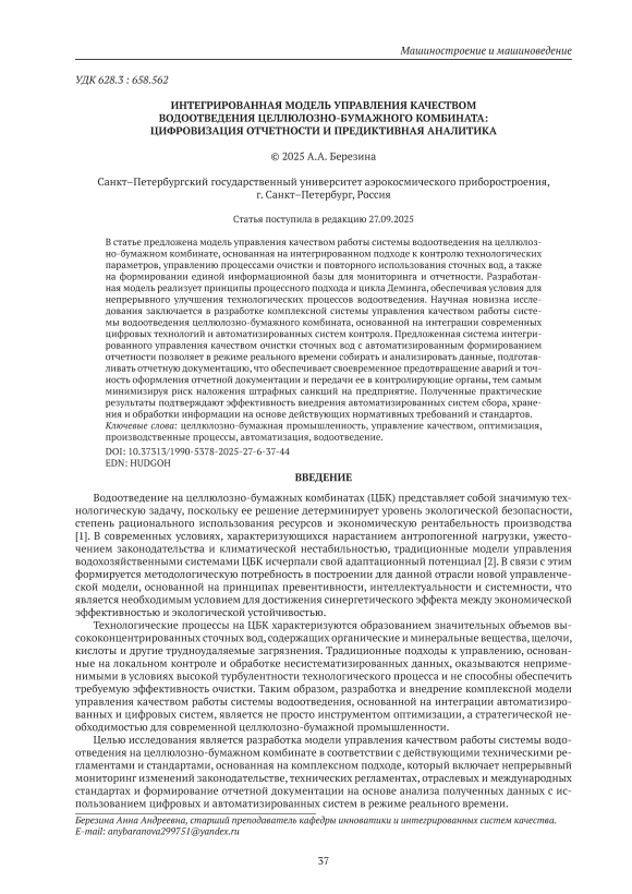 В статье предложена модель управления качеством работы системы водоотведения на целлюлозно-бумажном комбинате, основанная на интегрированном подходе к контролю технологических параметров, управлению процессами очистки и повторного использования сточных вод, а также на формировании единой информационной базы для мониторинга и отчетности. Разработанная модель реализует принципы процессного подхода и цикла Деминга, обеспечивая условия для непрерывного улучшения технологических процессов водоотведения. Научная новизна исследования заключается в разработке комплексной системы управления качеством работы системы водоотведения целлюлозно-бумажного комбината, основанной на интеграции современных цифровых технологий и автоматизированных систем контроля. Предложенная система интегрированного управления качеством очистки сточных вод с автоматизированным формированием отчетности позволяет в режиме реального времени собирать и анализировать данные, подготавливать отчетную документацию, что обеспечивает своевременное предотвращение аварий и точность оформления отчетной документации и передачи ее в контролирующие органы, тем самым минимизируя риск наложения штрафных санкций на предприятие. Полученные практические результаты подтверждают эффективность внедрения автоматизированных систем сбора, хранения и обработки информации на основе действующих нормативных требований и стандартов.