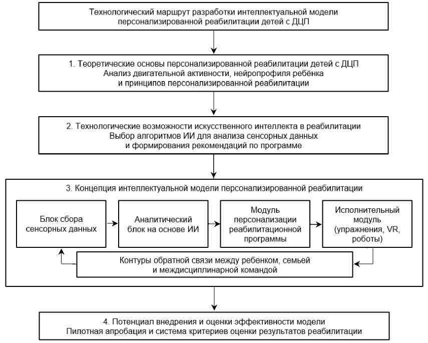 Методологическую основу исследования составили анализ и синтез научной литературы, системный и структурно-функциональный подход, теоретическое моделирование и логико-методологический анализ. Системный и структурно-функциональный подход реализовывался через выделение уровней «ребенок – семья – команда специалистов – технологическая платформа» и анализ их взаимодействия. Теоретическое моделирование проводилось поэтапно: от построения укрупненной схемы реабилитационного процесса до детализации функций отдельных модулей интеллектуальной системы и возможных сценариев их интеграции в существующие маршруты помощи (Линь Циншань и др., 2025). Применение указанных методов позволило обобщить подходы к оценке и повышению двигательной активности детей с ДЦП, выявить ограничения стандартных реабилитационных программ и вычленить основные блоки реабилитационного процесса и связи между ними. На этой основе была сформирована концепция интеллектуальной модели персонализированной реабилитации, включающей модуль сбора сенсорных данных, аналитический блок на базе искусственного интеллекта (ИИ), подсистему персонализации программы и контуры обратной связи между ребенком, его семьей и междисциплинарной командой специалистов.