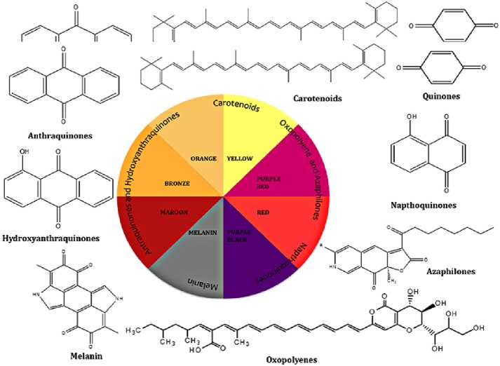Грибы представляют собой ценный источник пигментов (плодовое тело, питательная среда и мицелий), поскольку они способны давать высокие выходы вещества в дешевой питательной среде, что делает биопроцесс экономически выгодным в промышленном масштабе (Lagashetti et al., 2019; Shrikant and Sandeep, 2020; Wagh, 2021). Грибные пигменты – это внеклеточные метаболиты, которые можно использовать во многих продуктах (Diaz and Gerardo, 2022). На рисунке 1 можно увидеть некоторые оттенки, вырабатываемые различными классами метаболитов и их основными химическими структурами (меланины, антрахиноны, гидроксиантрахиноны, азафилоны, каротиноиды, оксополиены, хиноны и нафтохинон) (Özdemir, 2020).