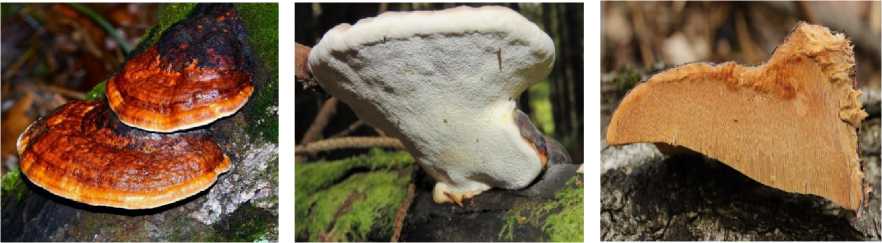 Из существующего множества представителей трутовиков объектом исследований выбран трутовик окаймленный (лат. Fomitopsis pinicola). Данный вид произрастает на валежнике, пнях, сухостое хвойных и лиственных деревьев, является сапрофитом, вызывающим бурую гниль, распространён на всей территории Республики Беларусь, а также России и Европы. Гриб отличается характерной окраской: полукруглая шляпка с концентрическими зонами разного цвета – от жёлтого и оранжевого до коричневого и чёрного, нижняя поверхность представляет собой трубчатый слой1 (рисунок 2). Плодовые тела Fomitopsis pinicola содержат множество уникальных биологически активных соединений. В последние годы из гриба получают множество химических экстрактов, содержащих большое число полезных ферментов: эндоглюканазу, ксиланазу, лаказу, целло-биогидролазу, β-1,4-глюкозидазу, а также питательные компоненты, такие как хитан и хитозан, тритерпены, производные тритерпенов, включая тритерпеновый спирт, тритерпеноиды ланостанова, тритерпеновые гликозиды, стероиды, биологически активные полисахариды (эндополисахариды и экзополисахариды) (Idrees, 2020).