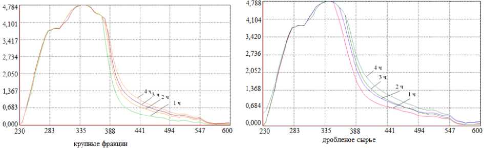 Cогласно данным литературных источников, для экстрагирования в рабочий раствор различных веществ из трутовиков требуется от 1 до 6 часов (Воробьева, 2023; Ооржак, 2020), поэтому в проводимых исследованиях для извлечения пигмента в раствор для последующего крашения шерстяной пряжи выбран временной интервал от 1 до 4 часов. На рисунке 5 представлен электронный спектр красильных растворов после каждого часа экстракции плодового тела крупных и дробленых фракций. Подготовка сырья проводились по схеме 1.