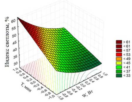 Анализ уравнений показывает, что на интенсивность окрашивания раствора красильной ванны оказывают влияние оба фактора: мощность генератора и время озвучивания.