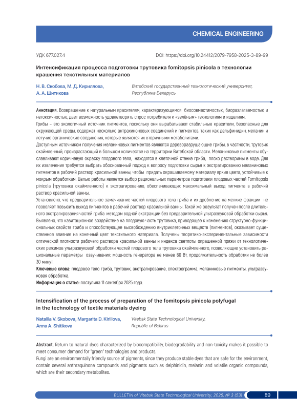 Возвращение к натуральным красителям, характеризующимся биосовместимостью, биоразлагаемостью и нетоксичностью, дает возможность удовлетворить спрос потребителя к «зелёным» технологиям и изделиям. Грибы – это экологичный источник пигментов, поскольку они вырабатывают стабильные красители, безопасные для окружающей среды, содержат несколько антрахиноновых соединений и пигментов, таких как дельфинидин, меланин и летучие органические соединения, которые являются их вторичными метаболитами. Доступным источником получения меланиновых пигментов являются дереворазрушающие грибы, в частности, трутовик окаймленный, произрастающий в большом количестве на территории Витебской области. Меланиновые пигменты обуславливают коричневую окраску плодового тела, находятся в клеточной стенке гриба, плохо растворимы в воде. Для их извлечения требуется выбрать обоснованный подход к вопросу подготовки сырья к экстрагированию меланиновых пигментов в рабочий раствор красильной ванны, чтобы придать окрашиваемому материалу яркие цвета, устойчивые к мокрым обработкам. Целью работы является выбор рациональных параметров подготовки плодовых частей Fomitopsis pinicola (трутовика окаймленного) к экстрагированию, обеспечивающих максимальный выход пигмента в рабочий раствор красильной ванны. Установлено, что предварительное замачивание частей плодового тела гриба и их дробление на мелкие фракции не позволяет повысить выход пигментов в рабочий раствор красильной ванны. Такой же результат получен после длительного экстрагирования частей гриба методом водной экстракции без предварительной ультразвуковой обработки сырья. Выявлено, что кавитационное воздействие на плодовую часть трутовика, приводящее к изменению структурно-функциональных свойств гриба и способствующее высвобождению внутриклеточных веществ (пигментов), оказывает существенное влияние на конечный цвет текстильного материала. Получены теоретико-экспериментальные зависимости оптической плотности рабочего раствора красильной ванны и индекса светлоты окрашенной пряжи от технологических режимов ультразвуковой обработки частей плодового тела трутовика окаймленного, позволяющие установить рациональные параметры озвучивания: мощность генератора не менее 60 Вт, продолжительность обработки не более 30 минут.