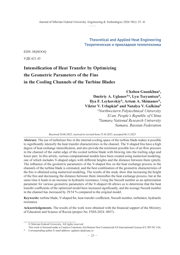 Использование рёбер‑турбулизаторов во внутреннем охлаждающем пространстве лопатки турбины позволяет существенно интенсифицировать характеристики теплоотдачи в канале. V‑образные рёбра обладают высокой степенью интенсификации теплообмена, а также обеспечивают минимально возможные потери давления воздушного потока в канале выходной кромки охлаждаемой лопатки турбины с выдувом в заднюю кромку и нижнюю часть. В данной статье с помощью численного моделирования созданы различные расчетные модели, одна из которых включает V‑образные ребра с различной высотой и расстоянием между ними (шагом). Оценено влияние геометрических параметров V‑образных ребер на процесс теплообмена в каналах лопатки турбины, а также с помощью численного моделирования получено наилучшее сочетание геометрических характеристик ребер. Результаты исследования показывают, что увеличение высоты ребер и уменьшение расстояния между ними интенсифицирует процесс теплообмена, но в то же время это приводит к увеличению гидравлического сопротивления. Использование числа Нуссельта в качестве параметра оптимизации при различных геометрических параметрах V‑образного ребра позволяет определить, что коэффициенты теплоотдачи оптимизированной модели значительно повысились, а среднее число Нуссельта в канале увеличилось на 29,54 % по сравнению с исходной моделью.