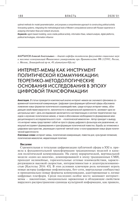 В статье проводится комплексный анализ интернет-мемов как значимого феномена современной политической коммуникации. Цифровая трансформация публичной сферы обусловила появление новых форматов политического взаимодействия, среди которых интернет-мемы, обладающие свойствами вирусности, лаконичности и эмоциональной заряженности, занимают одно из центральных мест. Цель исследования заключается в систематизации и синтезе теоретических подходов к изучению политических мемов, а также в обосновании необходимости формирования междисциплинарного исследовательского поля – «политической мемологии». Автор приходит к выводу, что интернет-мемы представляют собой не просто форму цифрового фольклора или развлечения, но мощный инструмент формирования и трансформации политической повестки, борьбы за гегемонию в цифровом пространстве, реализации стратегий «мягкой силы» и конструирования новых форм политической идентичности.