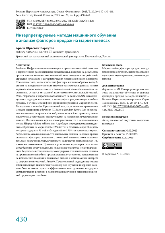 Введение. Цифровые торговые площадки представляют собой сложные и стремительно развивающиеся экосистемы, в которых на результаты продаж влияет комплексное взаимодействие поведения потребителей, стратегий продавцов и алгоритмических механизмов самих платформ. Понимание того, какие ключевые факторы и каким образом воздействуют на продажи в условиях высокой размерности данных, частых управленческих вмешательств и значительной взаимозависимости переменных, остается актуальной и методологически сложной задачей. Цель. Разработка и апробация основанного на данных (data-driven) модульного подхода к выявлению и анализу факторов, влияющих на объем продаж, с учетом специфики функционирования маркетплейсов. Материалы и методы. Предлагаемый подход основан на применении методов машинного обучения XGBoost и Random Forest. Для обеспечения адаптивности применяется обучение моделей по принципу скользящего окна с триггерами, реагирующими на изменения в распределении данных. Оценка вклада признаков осуществляется с использованием метода SHapley Additive exPlanations. Апробация подхода проведена на данных, собранных на маркетплейсе Wildberries и охватывающих 36 недель, которые содержат 56 448 наблюдений по 1568 товарным позициям. Результаты. Анализ показал, что наибольшее влияние на объем продаж оказывают факторы, связанные с поисковой видимостью и пользовательской вовлеченностью, в частности количество запросов в топ-100 и количество отзывов. Ценовые и рекламные характеристики также способствуют росту продаж, но их влияние оказалось менее выраженным. Результаты исследования демонстрируют, что наибольшее влияние на прогнозируемый объем продаж оказывают стратегии, направленные на повышение позиций в поисковой выдаче и активизацию интереса со стороны пользователей. Выводы. Предложенный подход представляет собой надежную аналитическую основу для изучения цифровых каналов сбыта и может служить эффективным инструментом поддержки управленческих решений в условиях динамичной и высококонкурентной среды маркетплейсов.