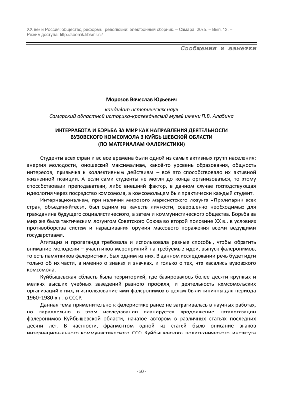 Интерработа и борьба за мир как направления деятельности вузовского комсомола в Куйбышевской области (по материалам фалеристики)