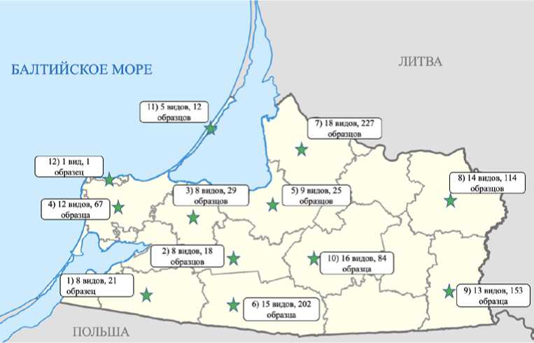 Самые крупные по числу сборов административные районы Калининградской области – Правдинский, Славский и Нестеровский район (больше 120 образцов из каждого района) (рис. 3). Однако не все административные районы Калининградской области охвачены сборами коллекции. Такое распределение образцов, вероятнее всего, связано с особенностью сборов – в вышеперечисленных административных районах располагаются крупные болотные экосистемы (верховое болото Целау, Большое Моховое болото), а также заболоченные леса. Данные экосистемы были подробно исследованы в ходе сбора материалов для научной работы по болотам региона (Napreenko, 2002). В связи с этим нельзя сделать вывод о полном видовом разнообразии административных районов Калининградской области – сборы были большей частью привязаны к конкретному типу экосистем.