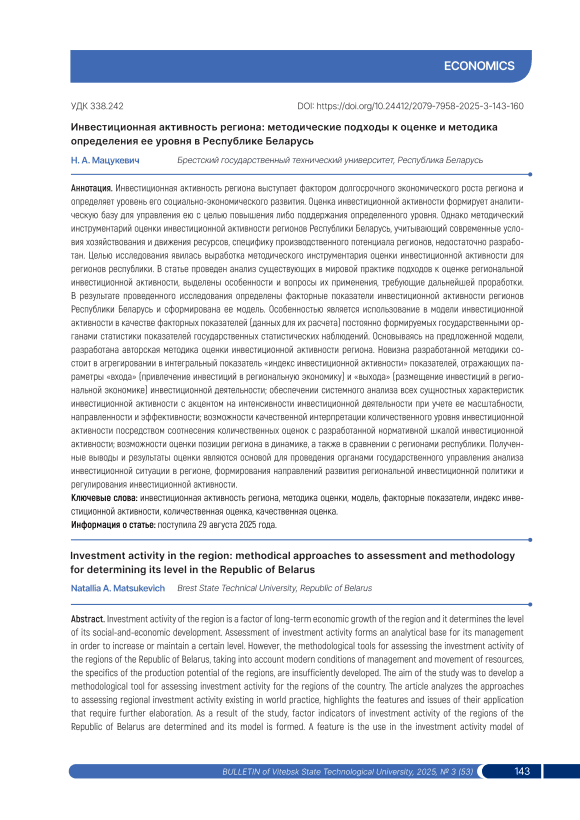 Инвестиционная активность региона выступает фактором долгосрочного экономического роста региона и определяет уровень его социально-экономического развития. Оценка инвестиционной активности формирует аналитическую базу для управления ею с целью повышения либо поддержания определенного уровня. Однако методический инструментарий оценки инвестиционной активности регионов Республики Беларусь, учитывающий современные условия хозяйствования и движения ресурсов, специфику производственного потенциала регионов, недостаточно разработан. Целью исследования явилась выработка методического инструментария оценки инвестиционной активности для регионов республики. В статье проведен анализ существующих в мировой практике подходов к оценке региональной инвестиционной активности, выделены особенности и вопросы их применения, требующие дальнейшей проработки. В результате проведенного исследования определены факторные показатели инвестиционной активности регионов Республики Беларусь и сформирована ее модель. Особенностью является использование в модели инвестиционной активности в качестве факторных показателей (данных для их расчета) постоянно формируемых государственными органами статистики показателей государственных статистических наблюдений. Основываясь на предложенной модели, разработана авторская методика оценки инвестиционной активности региона. Новизна разработанной методики состоит в агрегировании в интегральный показатель «индекс инвестиционной активности» показателей, отражающих параметры «входа» (привлечение инвестиций в региональную экономику) и «выхода» (размещение инвестиций в региональной экономике) инвестиционной деятельности; обеспечении системного анализа всех сущностных характеристик инвестиционной активности с акцентом на интенсивности инвестиционной деятельности при учете ее масштабности, направленности и эффективности; возможности качественной интерпретации количественного уровня инвестиционной активности посредством соотнесения количественных оценок с разработанной нормативной шкалой инвестиционной активности; возможности оценки позиции региона в динамике, а также в сравнении с регионами республики. Полученные выводы и результаты оценки являются основой для проведения органами государственного управления анализа инвестиционной ситуации в регионе, формирования направлений развития региональной инвестиционной политики и регулирования инвестиционной активности.