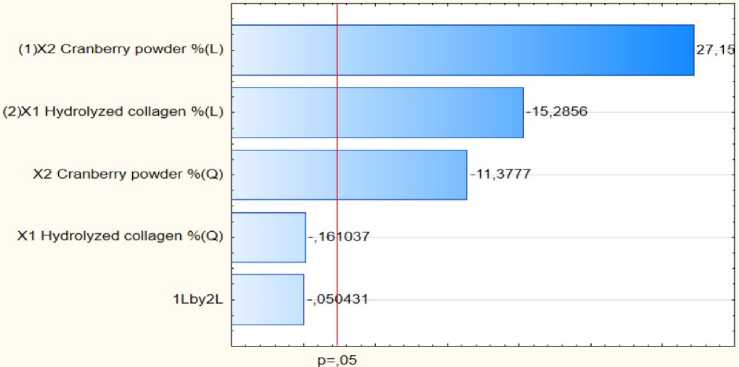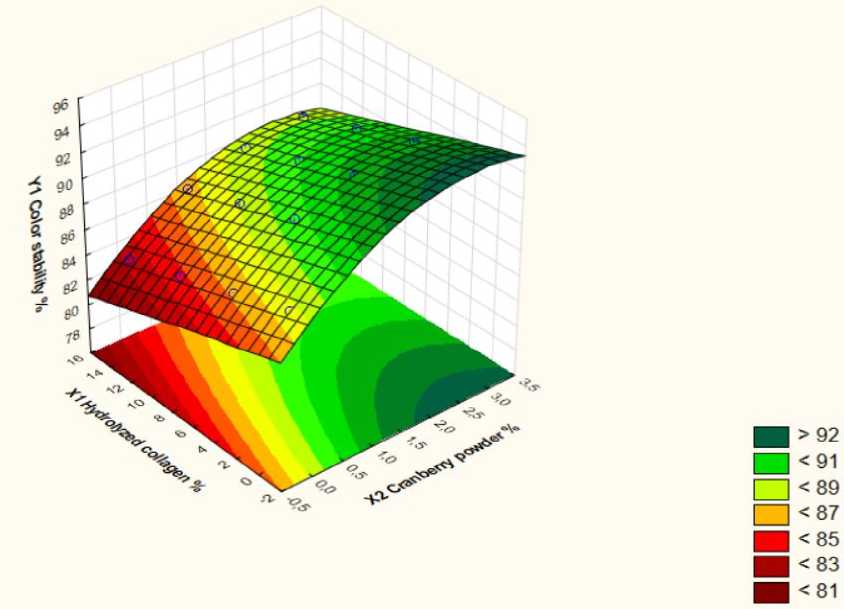 Based on experimental data, a second-order quadratic model was constructed for the response Y = Color stability, % according to the factors: X₁ = hydrolyzed collagen, % and X₂ = cranberry powder, %: