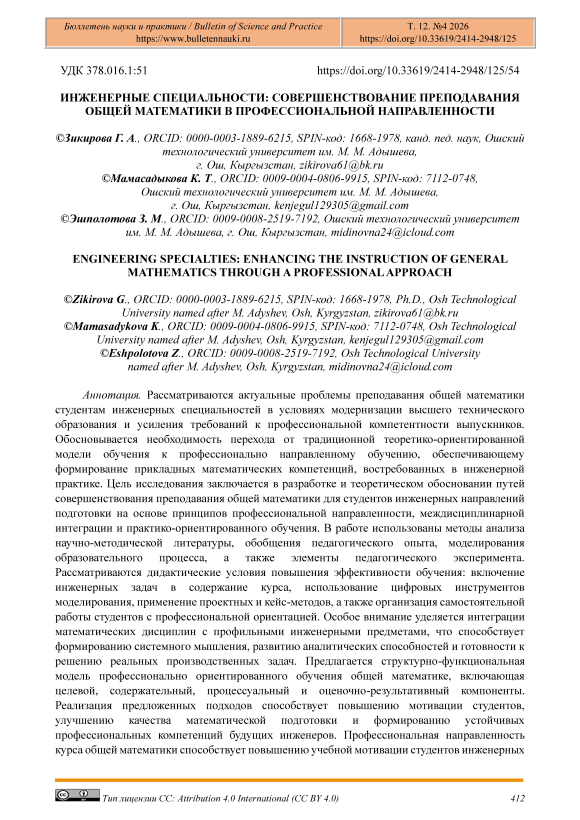 Рассматриваются актуальные проблемы преподавания общей математики студентам инженерных специальностей в условиях модернизации высшего технического образования и усиления требований к профессиональной компетентности выпускников. Обосновывается необходимость перехода от традиционной теоретико-ориентированной модели обучения к профессионально направленному обучению, обеспечивающему формирование прикладных математических компетенций, востребованных в инженерной практике. Цель исследования заключается в разработке и теоретическом обосновании путей совершенствования преподавания общей математики для студентов инженерных направлений подготовки на основе принципов профессиональной направленности, междисциплинарной интеграции и практико-ориентированного обучения. В работе использованы методы анализа научно-методической литературы, обобщения педагогического опыта, моделирования образовательного процесса, а также элементы педагогического эксперимента. Рассматриваются дидактические условия повышения эффективности обучения: включение инженерных задач в содержание курса, использование цифровых инструментов моделирования, применение проектных и кейс-методов, а также организация самостоятельной работы студентов с профессиональной ориентацией. Особое внимание уделяется интеграции математических дисциплин с профильными инженерными предметами, что способствует формированию системного мышления, развитию аналитических способностей и готовности к решению реальных производственных задач. Предлагается структурно-функциональная модель профессионально ориентированного обучения общей математике, включающая целевой, содержательный, процессуальный и оценочно-результативный компоненты. Реализация предложенных подходов способствует повышению мотивации студентов, улучшению качества математической подготовки и формированию устойчивых профессиональных компетенций будущих инженеров. Профессиональная направленность курса общей математики способствует повышению учебной мотивации студентов инженерных специальностей, так как демонстрирует практическую значимость математических методов в решении реальных инженерных задач. Совершенствование преподавания общей математики на основе принципа профессиональной направленности является важным условием повышения качества подготовки будущих инженеров и их конкурентоспособности в современных социально-экономических условиях.