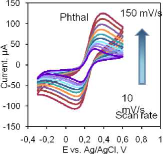 CV at 50 mV/s (b), CV at 10-150 mV/s for Phthal (c) and dependence of peak current on scanning rate for Phthal (d)