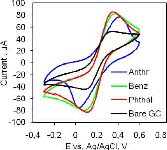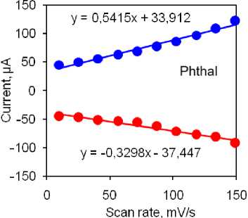 The highest currents for reduction and oxidation peaks were observed with the same electrode. The Benz electrode exhibited a similar current response, while the Anthr and bare GC electrodes demonstrated lower currents (Fig. 4b). Additionally, the Phthal electrode displayed the smallest peak-to-peak separation, indicating excellent diffusion capabilities and low resistance at the electrode-testing solution interface. Considering these findings, we recommend further analysis using the Phthal electrode. To further investigate the electrocatalytic properties of this electrode, we examined the effect of scanning speed on the catalytic response in the same solution. The results are summarized in Figs. 4c and 4d. Increasing the scanning speed from 10 to 150 mV/s resulted in a linear increase in the peak currents for both redox processes. This linearity is demonstrated by the corresponding linear equations given in Figure 4d. The linear relationship between peak currents and scanning rates suggests that the processes at the electrode surface are adsorption-controlled. This assumption is further supported by a slight, yet noticeable, shift in the peak potentials – oxidation towards more positive values and reduction towards more negative values, indicating adsorption-controlled reactions.