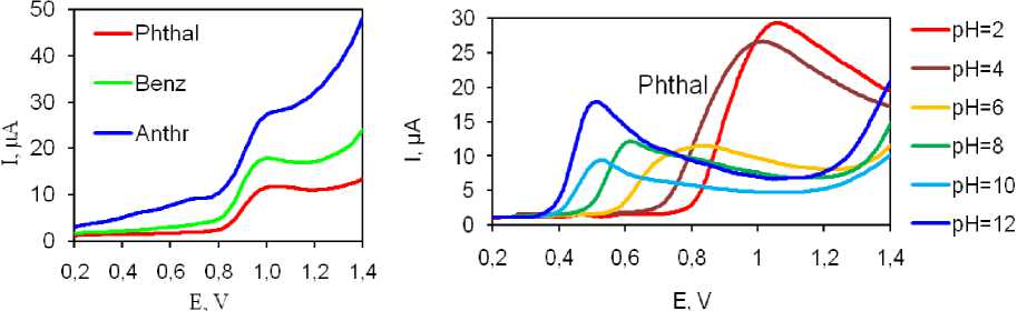 Fig. 5. Phenol oxidation: peaks on three electrodes (a), phenol CV on Phthal electrode in buffer solutions, С=1 mM (b), dependence of the peak potential on pH on Phthal electrode (c), dependence of current in relation to pH on Phthal electrode (d)