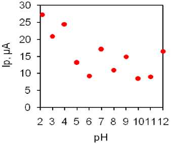 After working with a solution of Fe+2/+3, the influence of pH on phenol oxidation in buffer solutions with pH from 2 to 12 was studied. Experiments were carried out on the same electrodes (1 mM phenol, potential range –0.1…+1.5 V, scan rate 50 mV/s). Supporting electrolytes (Britton-Robinson buffers) were prepared with a mixture of acids (0.04 M CH 3 COOH, 0.04 M H 3 PO 4 , 0.04 M H 3 BO 3 ). The solution 1 M NaOH was used to adopt desired pH.