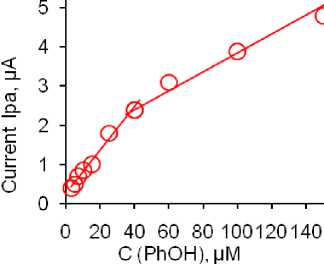 Then, at the optimal pH, a series of CVs were carried out with an increase in the phenol concentration from 1 μM to 1 mM. Prior each new cycle, the surface of the paste electrode was cleaned by cutting off a 0.1 mm thick layer of paste.