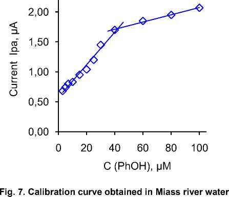 Application of the method in natural water. The practical use of the method was tested in surface water obtained from the Miass River in the city of Chelyabinsk. Since the initial tests showed that there is no detectable concentration of phenol in this water, we tried to spike the sample with different concentrations of phenol covering the entire linear range as in the case of the development of the detection method. It is important to note that the basic electrolyte was prepared using 10 ml of BRBS buffer and 40 ml of river water. Fig. 7 shows the linear curve of SWV voltammogram current dependence on phenol concentration. As can be seen, the appearance of this curve is identical to the case of method development, so it can be concluded that there is no significant matrix effect of natural waters on the determination of phenol using our sensor. Slightly lower values of the current can be attributed to the conductivity (due to dilution), while the only influence of the matrix can be seen in a slightly higher value of the background current, but this is an expected effect.