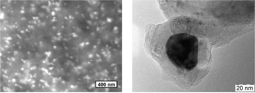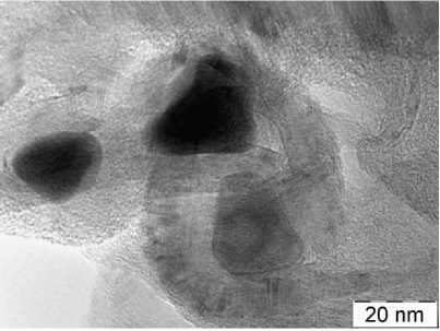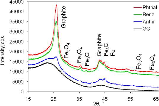 Morphology and structure of the Materials. According to scanning electron microscopy, it can be concluded that particles of crystalline phases form agglomerates ranging in size from 20 to 200 nm (Fig. 2). Transmission electron microscopy reveals iron containing particles of 10 … 30 nm in size, and often these particles are surrounded by a multilayer “blanket” of graphite, 5 … 10 nm thick. Benzene vapor adsorption was measured at partial pressure 0.7 P 0 of saturated benzene vapor above grinded composites. Per 100 g of Anthr, Phthal and Benz composites it was absorbed 7.2, 15.9 and 14.1 g of benzene. These values are proportional to microporosity and surface area of the material.