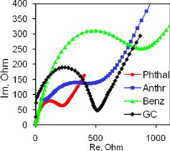 Electrochemical Characterization of the Electrodes. EIS and CV measurements were utilized in the analysis of electrochemical properties of the prepared materials within the field of electroanalytical chemistry. The examination of the samples using the [Fe(CN) 6 ]3–/4– redox probe revealed that the Phthal composite exhibited the lowest resistance (Fig. 4a). The Rct value for the Phthal electrode was calculated to be around 300 Ω, while the other electrodes displayed higher values: bare GC electrode 510 Ω, Anthr electrode 900 Ω, and Benz modified electrode 1200 Ω. Similarly, cyclic voltammetry provided comparable results.