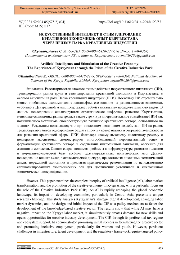 Данное исследование представляет собой углубленный анализ развивающейся экономики одной из стран Центральной Азии, её взаимодействия с искусственным интеллектом, эволюции рынка труда и креативных индустрий. Значительная часть существующих научных исследований, посвященных влиянию ИИ на рынки труда, преимущественно сосредоточена на странах с развитой экономикой. Сосредоточившись на Кыргызстане, данное исследование вносит значительный вклад в зарождающийся, но растущий массив литературы о последствиях использования ИИ и мерах политики в развивающихся странах. Помимо академического вклада, исследование предоставляет практические и действенные идеи для людей, принимающих решение, не только в Кыргызстане, но и в других странах с развивающейся экономикой, стремящихся использовать потенциал креативной экономики и искусственного интеллекта для устойчивого развития, создания рабочих мест и стратегической экономической диверсификации. В анализе будет особо отмечена эффективность целевых инструментов политики, таких как создание специальных экономических зон (на примере ПКИ), в решении широко распространенной проблемы неформальной экономики и стимулировании инноваций в зарождающихся секторах с высокой добавленной стоимостью.